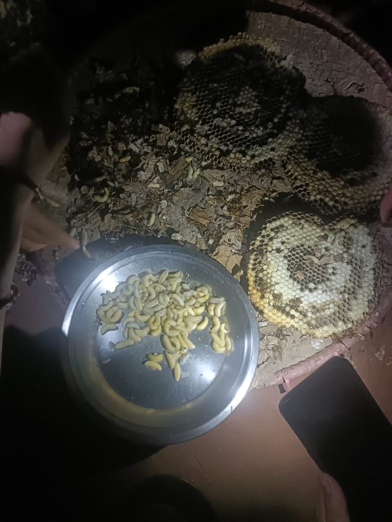 Hornet Larvae (Aringal) are considered a nutritious delicacy in many rural parts of Nepal. They are typically harvested from large nests in forests and then fried or cooked into a savory dish.